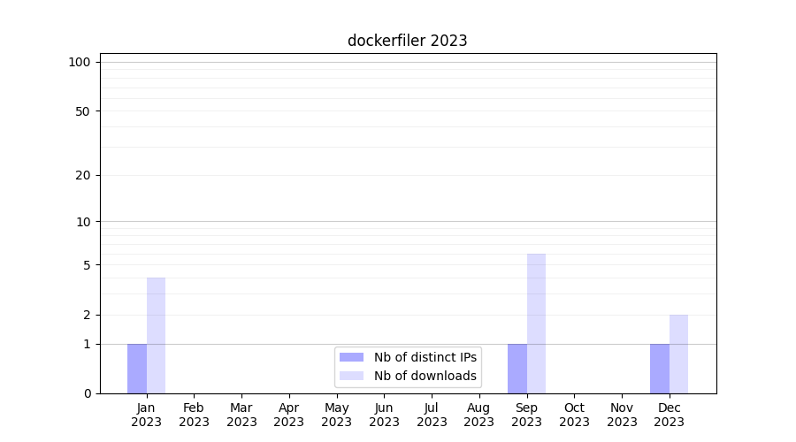 Number of downloads for software package dockerfiler, year by year, from 2025 back to 2014 (years with no downloads are omitted):