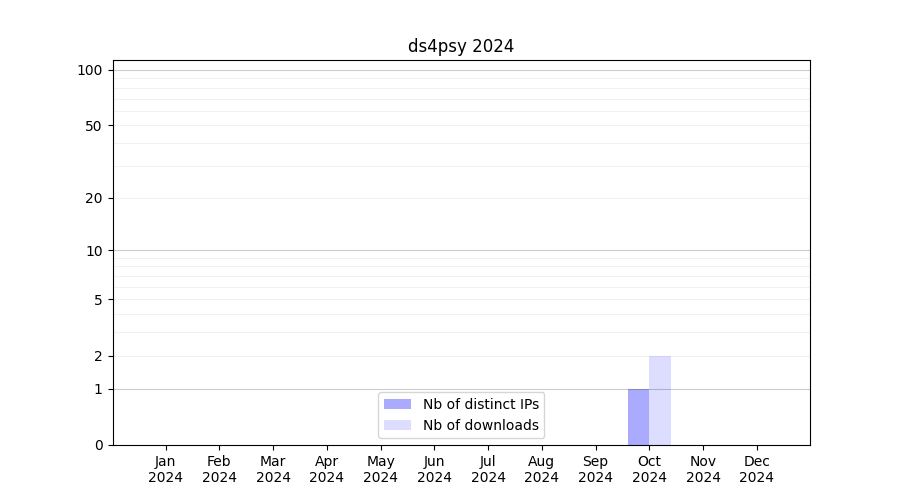 Number of downloads for software package ds4psy, year by year, from 2025 back to 2014 (years with no downloads are omitted):