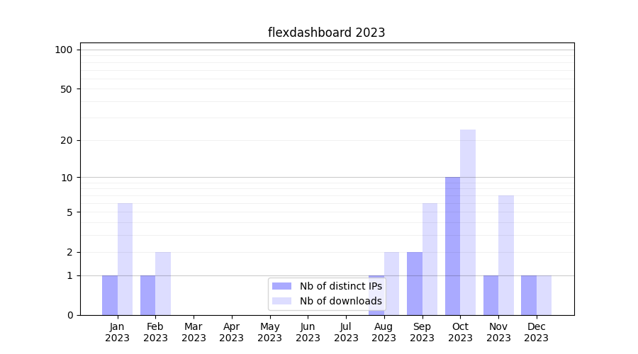 Number of downloads for software package flexdashboard, year by year, from 2025 back to 2014 (years with no downloads are omitted):