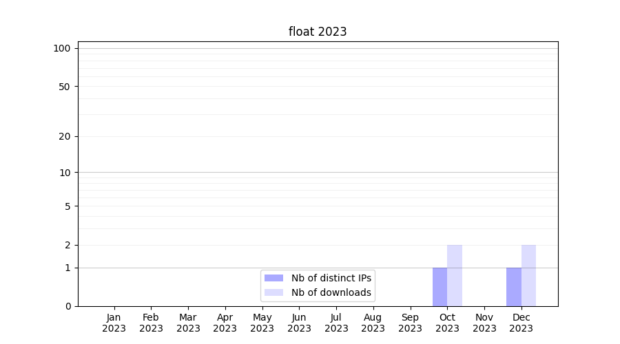 Number of downloads for software package float, year by year, from 2025 back to 2014 (years with no downloads are omitted):