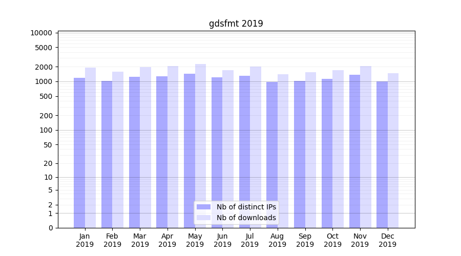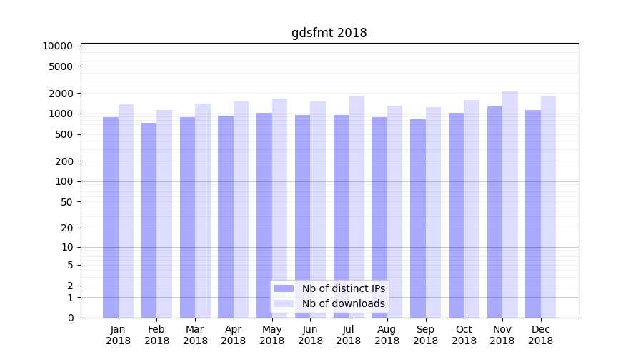 Number of downloads for software package gdsfmt, year by year, from 2025 back to 2014 (years with no downloads are omitted):