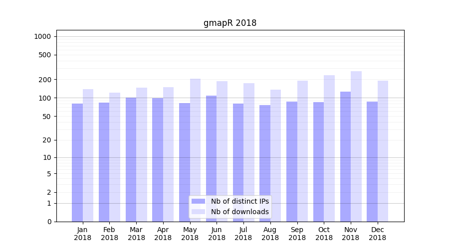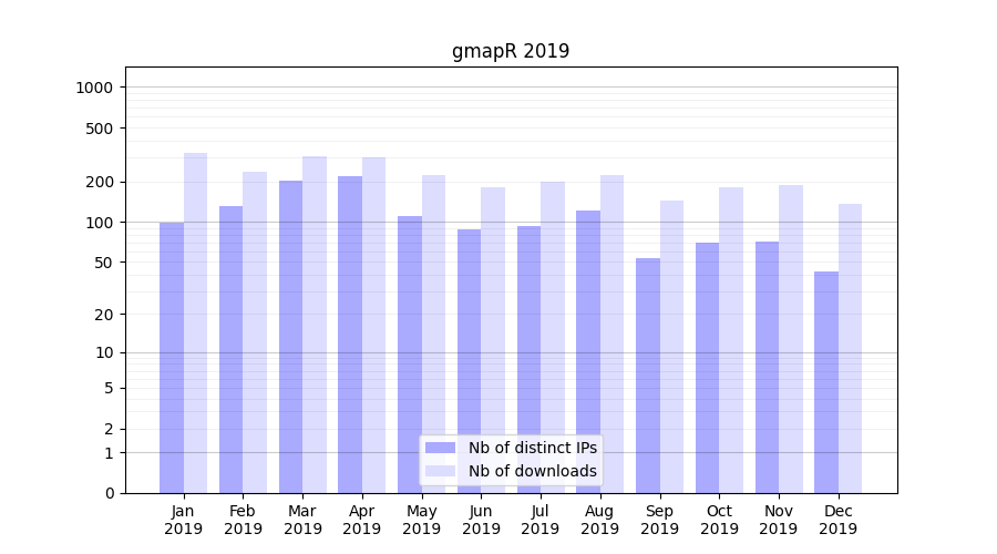 Number of downloads for software package gmapR, year by year, from 2025 back to 2014 (years with no downloads are omitted):
