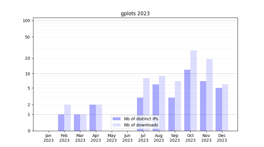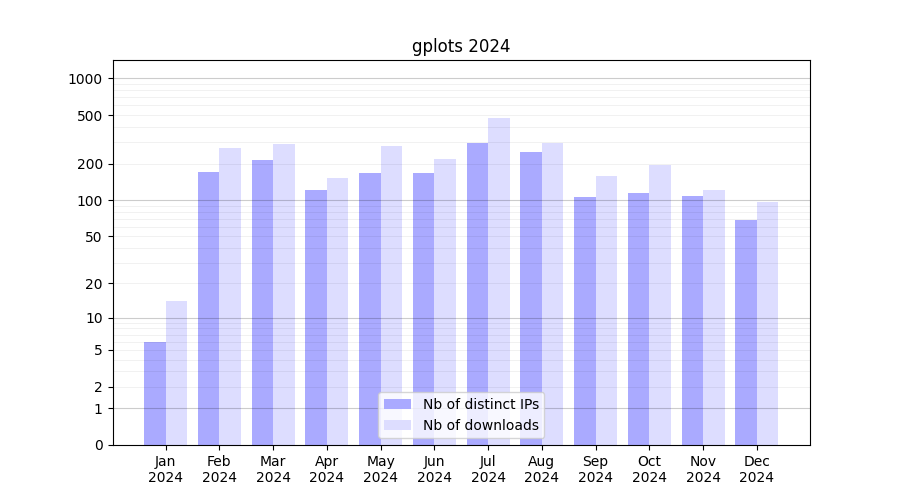 Number of downloads for software package gplots, year by year, from 2025 back to 2014 (years with no downloads are omitted):