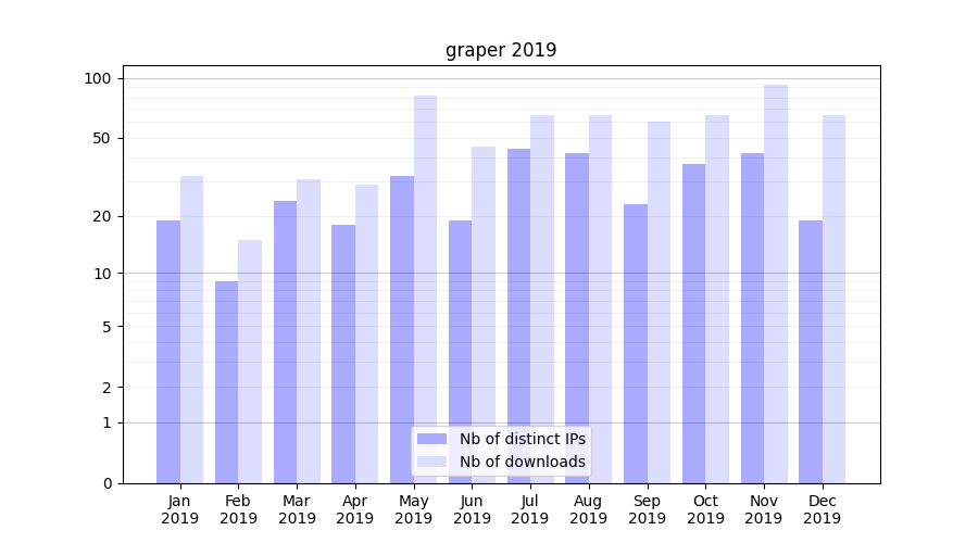 Number of downloads for software package graper, year by year, from 2025 back to 2014 (years with no downloads are omitted):