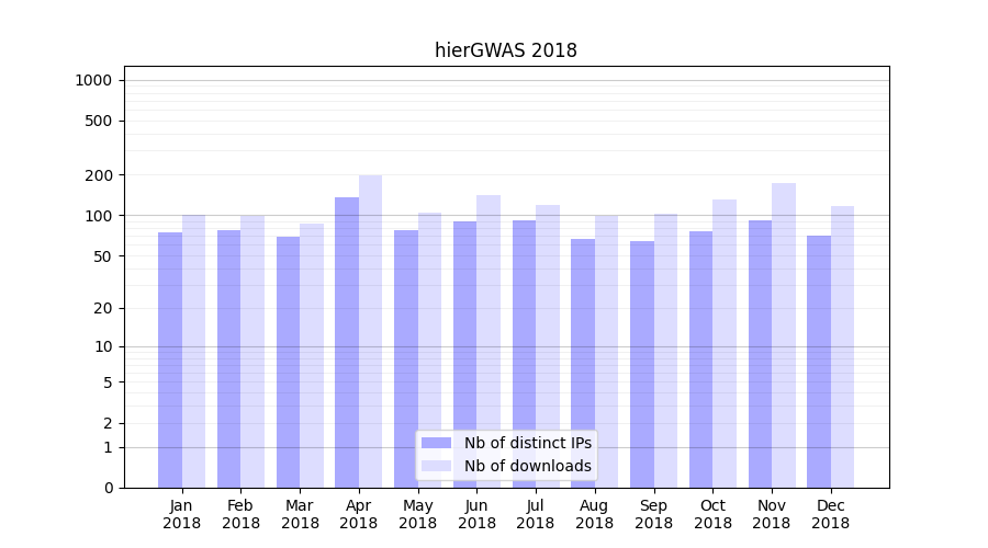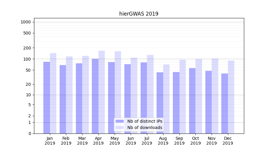 Number of downloads for software package hierGWAS, year by year, from 2025 back to 2014 (years with no downloads are omitted):