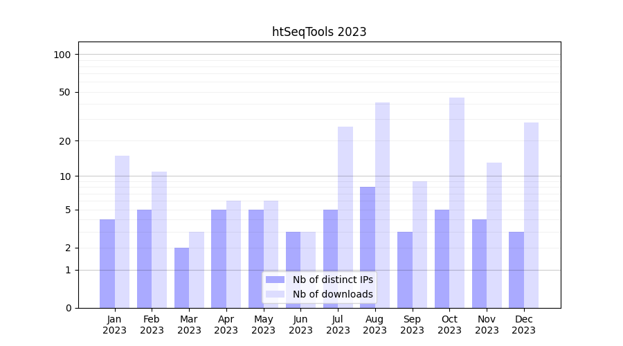 Number of downloads for software package htSeqTools, year by year, from 2025 back to 2014 (years with no downloads are omitted):