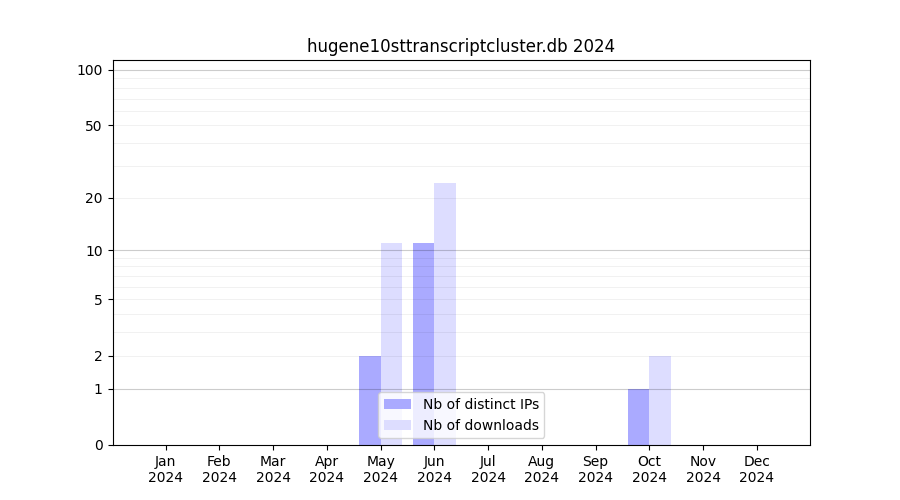 Number of downloads for software package hugene10sttranscriptcluster.db, year by year, from 2025 back to 2014 (years with no downloads are omitted):