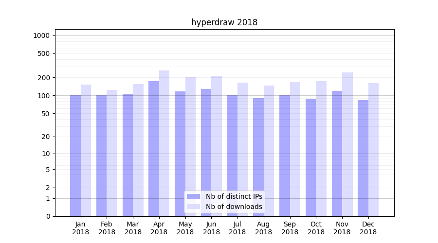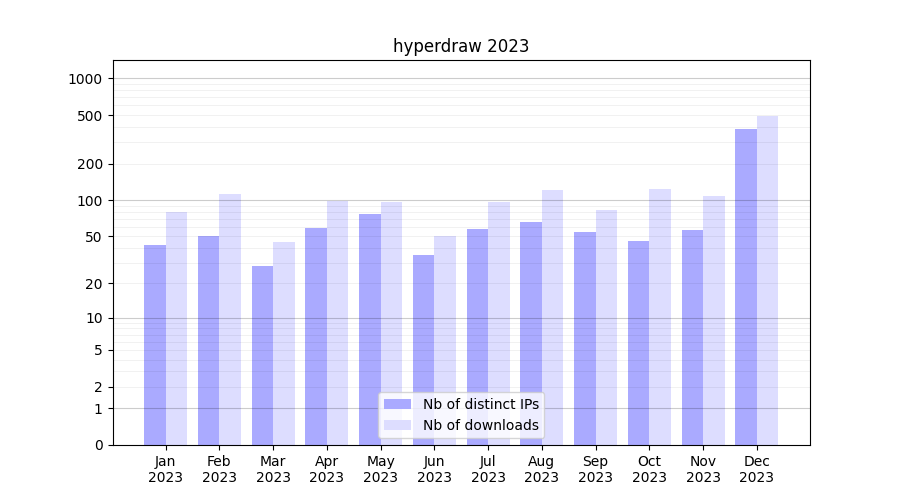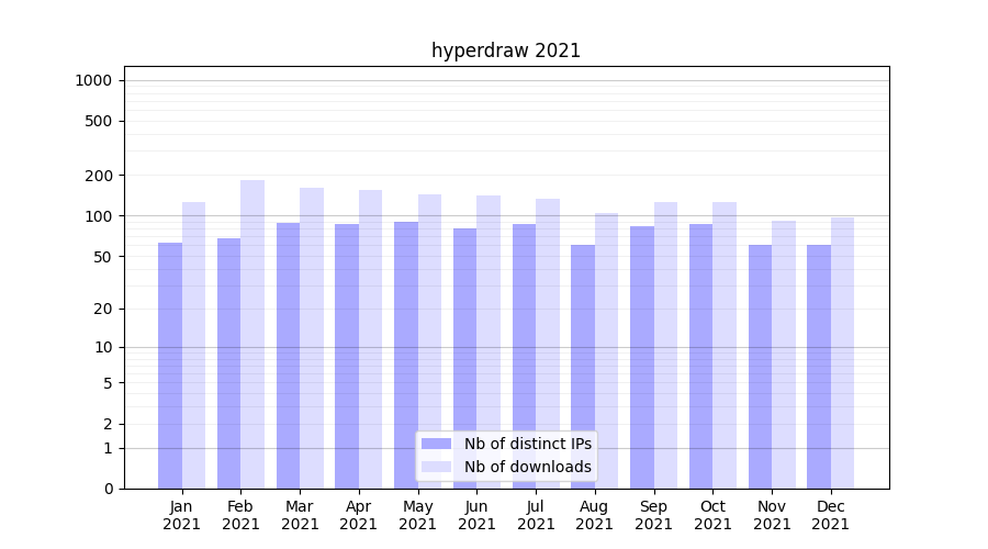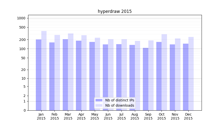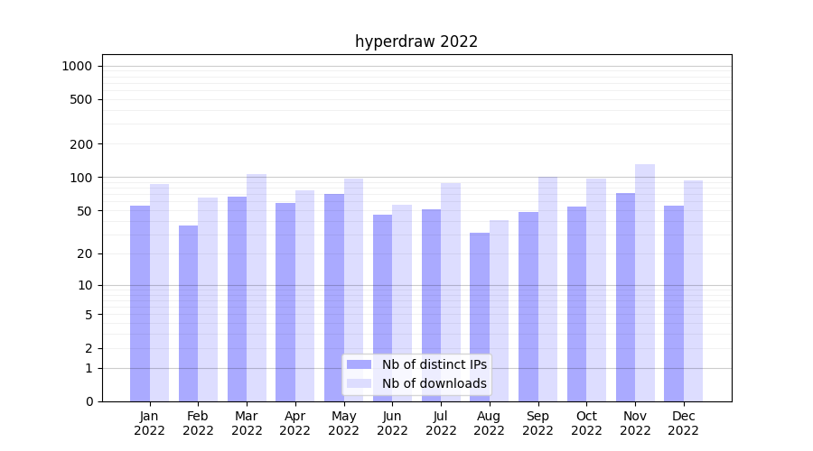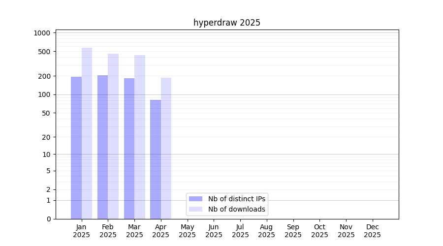 Number of downloads for software package hyperdraw, year by year, from 2025 back to 2014 (years with no downloads are omitted):