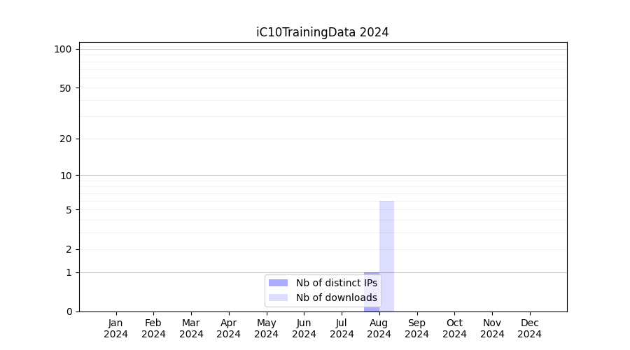 Number of downloads for software package iC10TrainingData, year by year, from 2025 back to 2014 (years with no downloads are omitted):