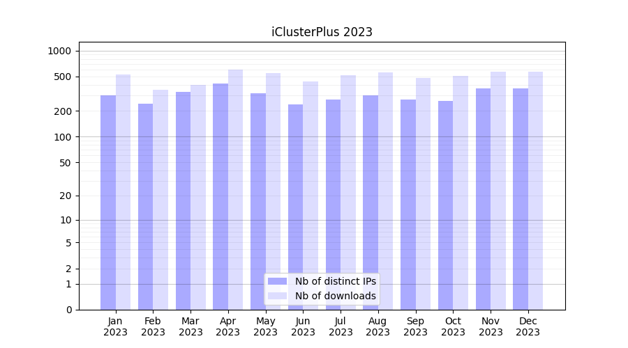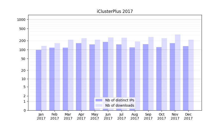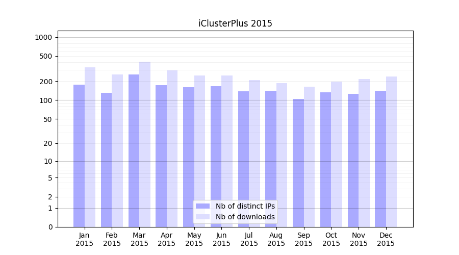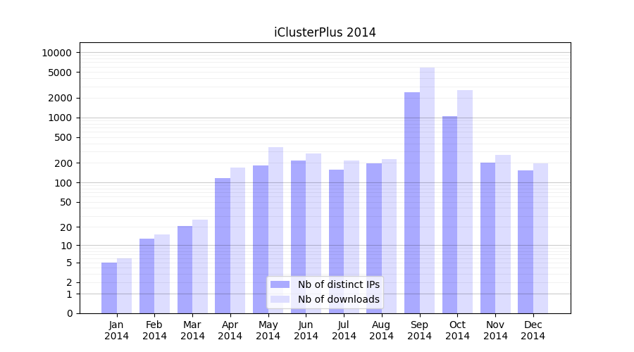Number of downloads for software package iClusterPlus, year by year, from 2025 back to 2014 (years with no downloads are omitted):