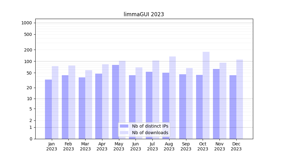 Number of downloads for software package limmaGUI, year by year, from 2025 back to 2014 (years with no downloads are omitted):
