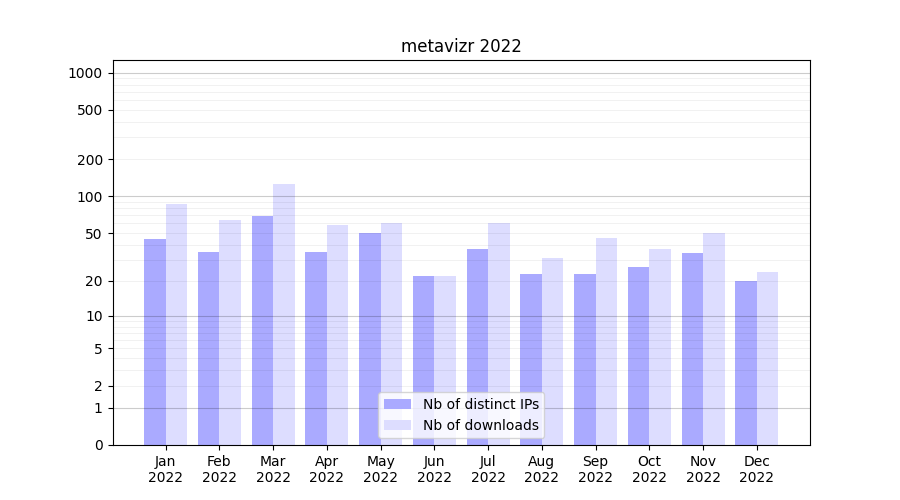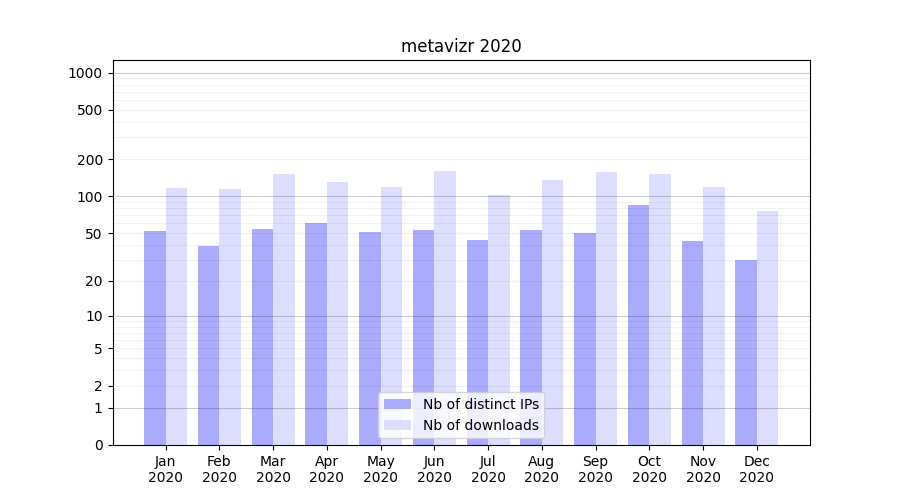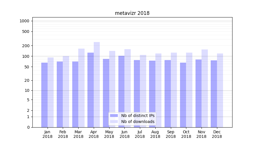 Number of downloads for software package metavizr, year by year, from 2025 back to 2014 (years with no downloads are omitted):