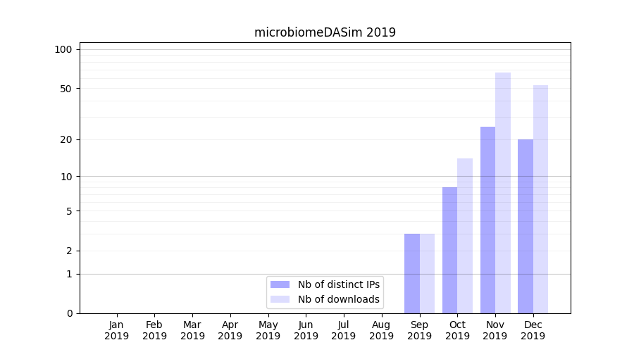 Number of downloads for software package microbiomeDASim, year by year, from 2025 back to 2014 (years with no downloads are omitted):