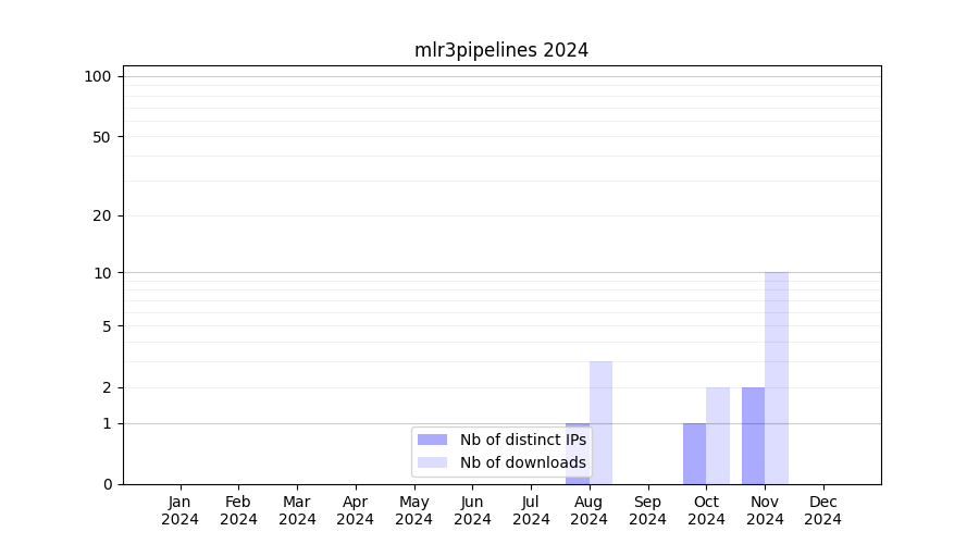 Number of downloads for software package mlr3pipelines, year by year, from 2025 back to 2014 (years with no downloads are omitted):