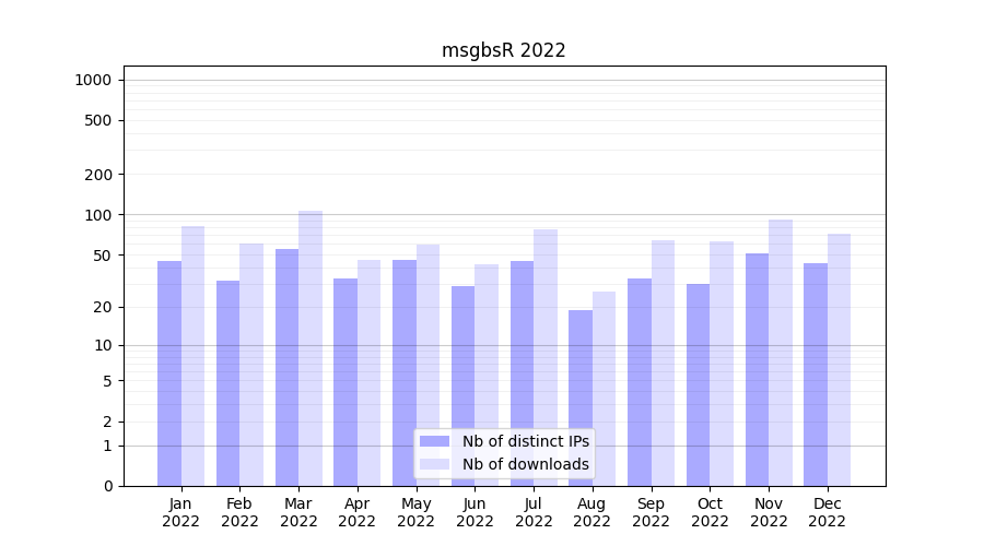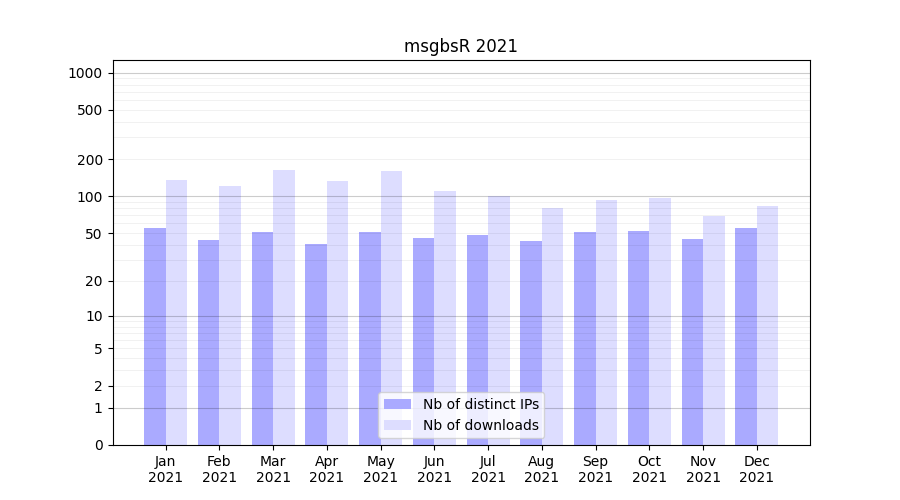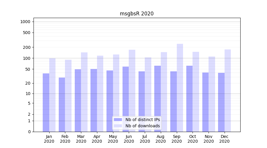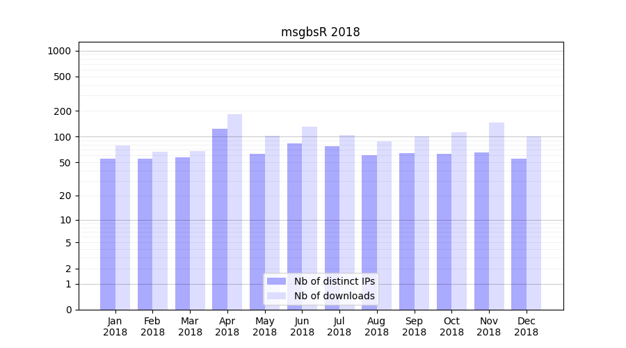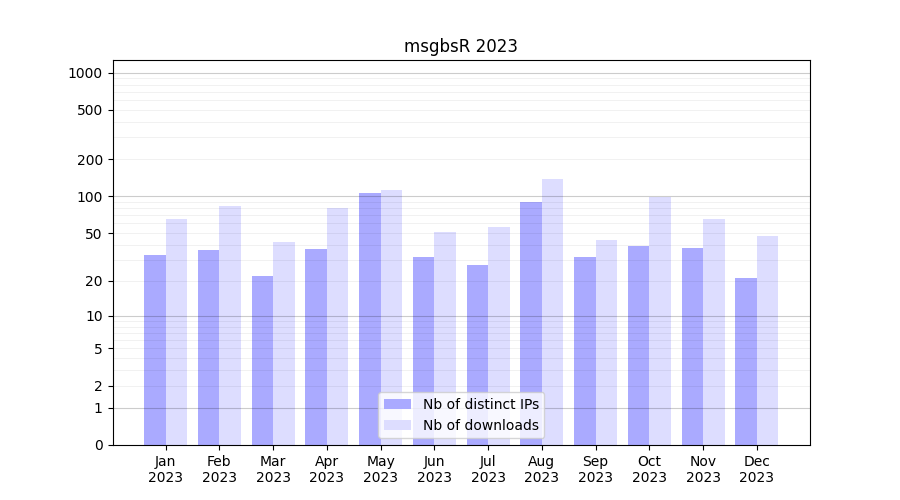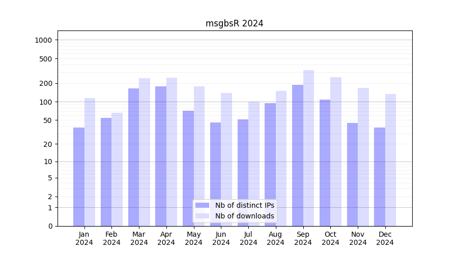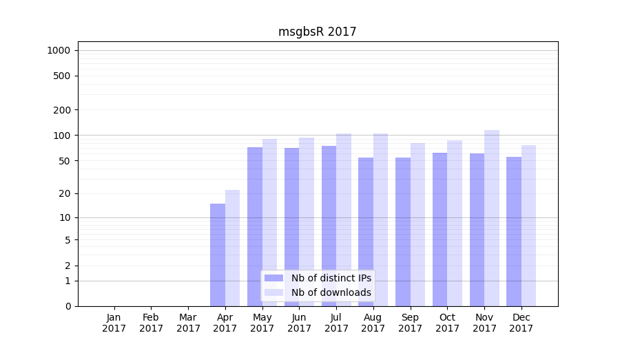 Number of downloads for software package msgbsR, year by year, from 2025 back to 2014 (years with no downloads are omitted):