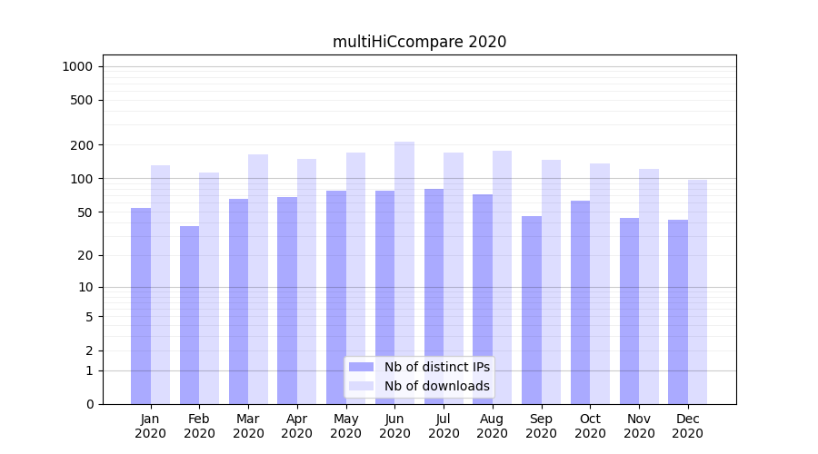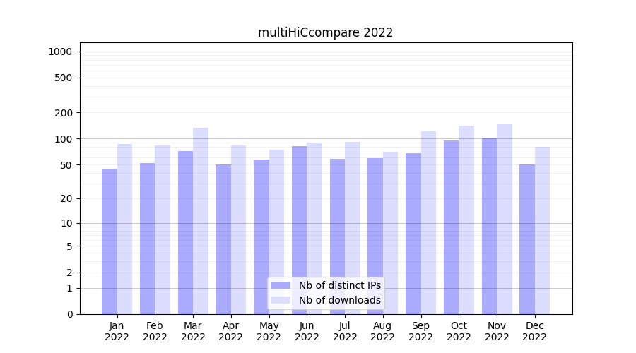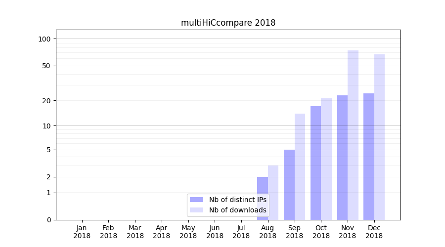Number of downloads for software package multiHiCcompare, year by year, from 2025 back to 2014 (years with no downloads are omitted):