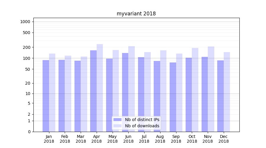 Number of downloads for software package myvariant, year by year, from 2025 back to 2014 (years with no downloads are omitted):