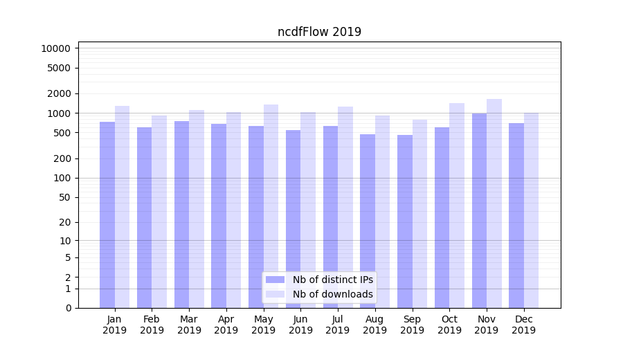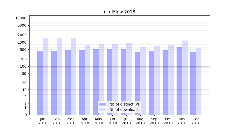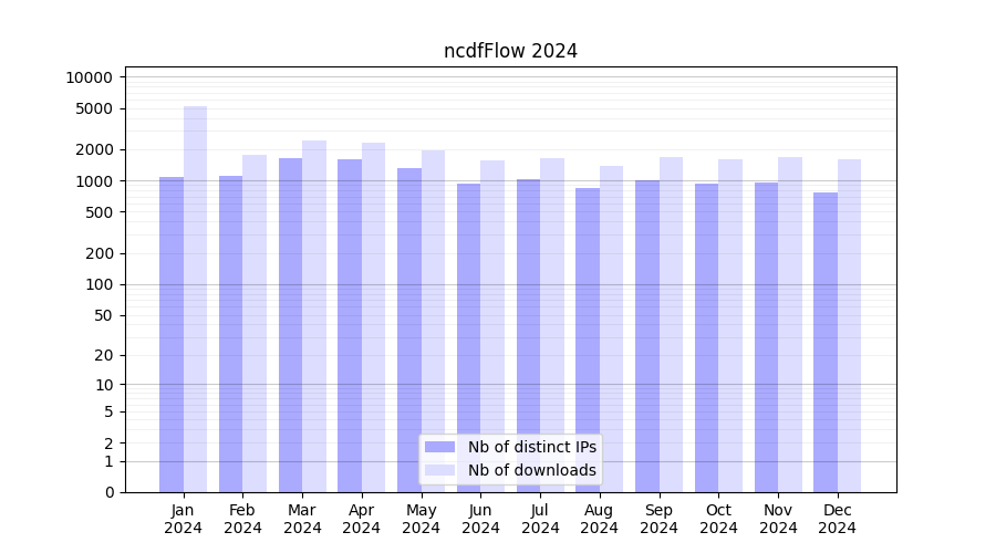Number of downloads for software package ncdfFlow, year by year, from 2025 back to 2014 (years with no downloads are omitted):
