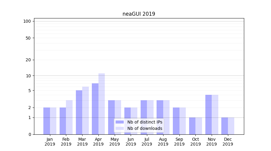 Number of downloads for software package neaGUI, year by year, from 2025 back to 2014 (years with no downloads are omitted):