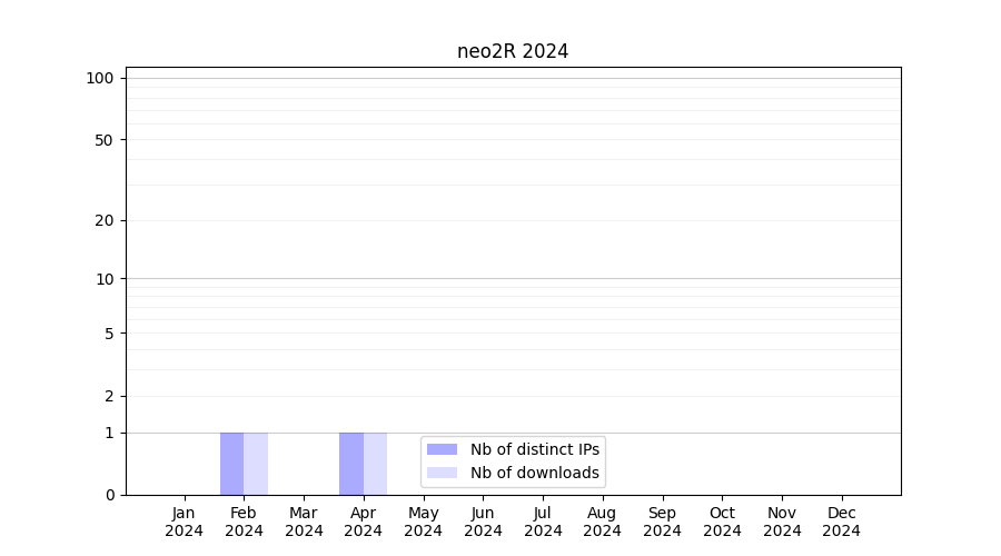 Number of downloads for software package neo2R, year by year, from 2025 back to 2014 (years with no downloads are omitted):