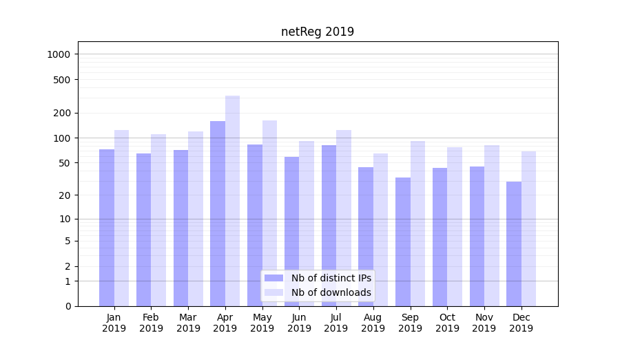Number of downloads for software package netReg, year by year, from 2025 back to 2014 (years with no downloads are omitted):