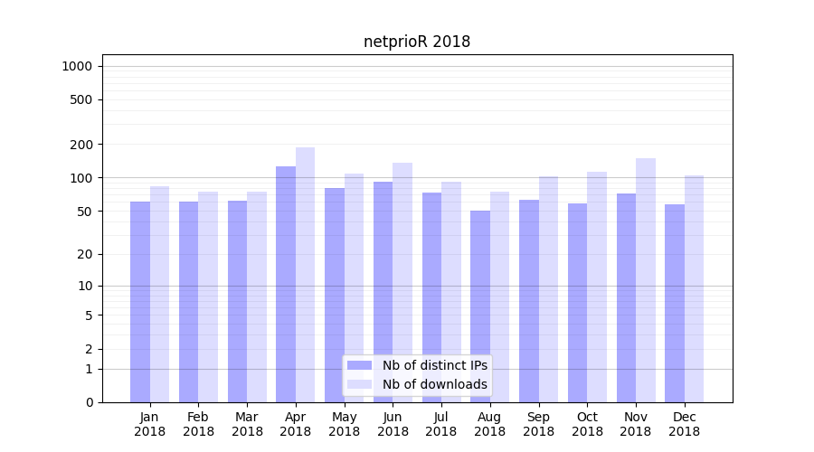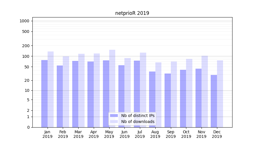 Number of downloads for software package netprioR, year by year, from 2025 back to 2014 (years with no downloads are omitted):