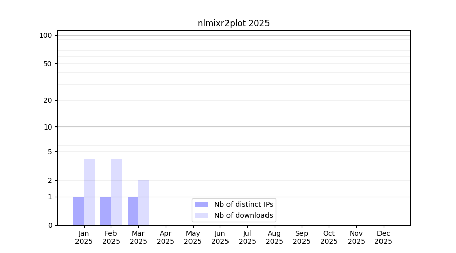 Number of downloads for software package nlmixr2plot, year by year, from 2025 back to 2014 (years with no downloads are omitted):