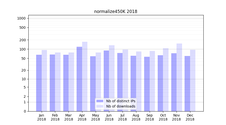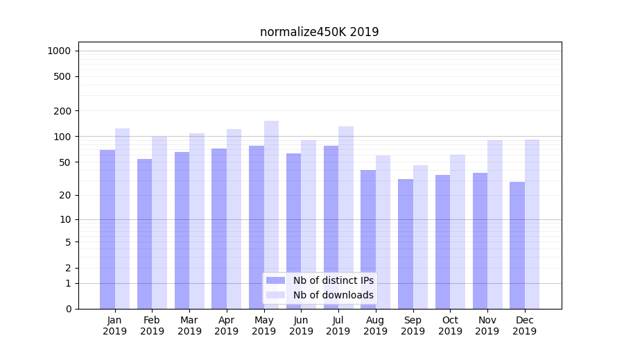 Number of downloads for software package normalize450K, year by year, from 2025 back to 2014 (years with no downloads are omitted):