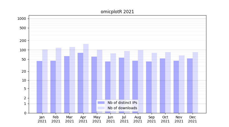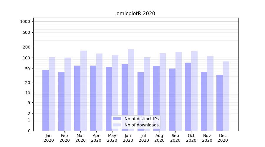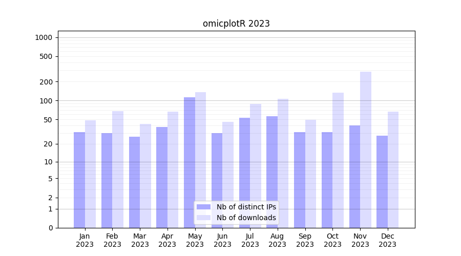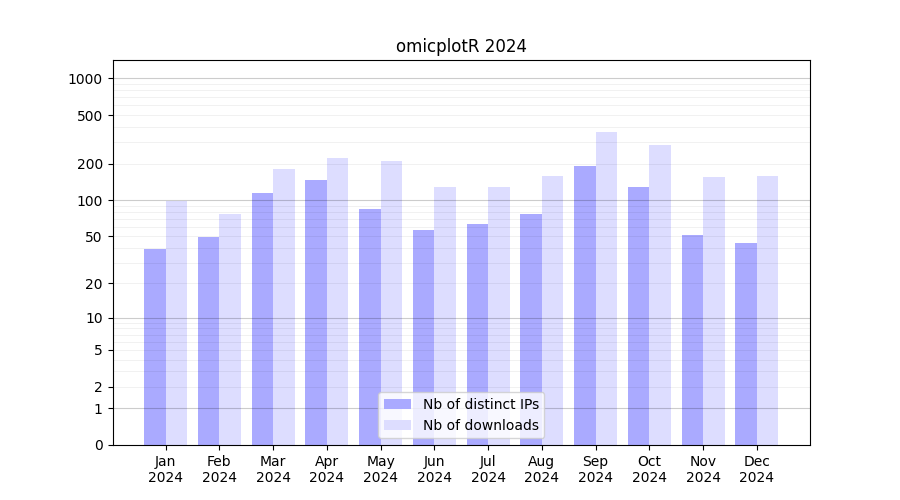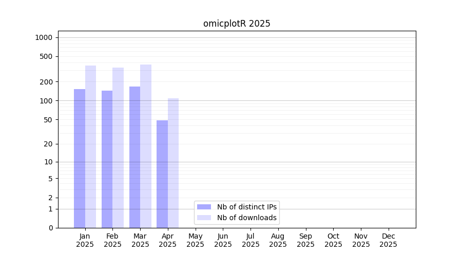 Number of downloads for software package omicplotR, year by year, from 2025 back to 2014 (years with no downloads are omitted):