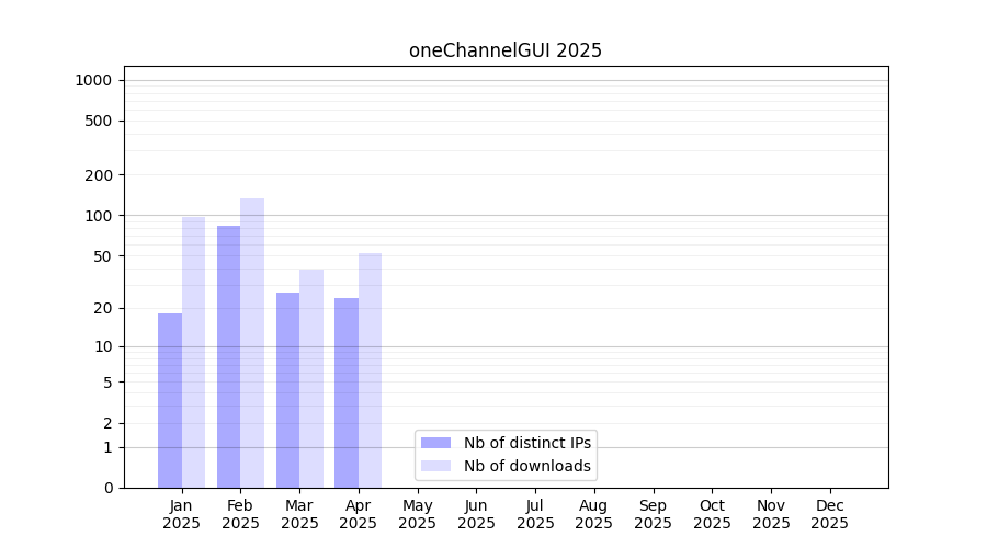 Number of downloads for software package oneChannelGUI, year by year, from 2025 back to 2014 (years with no downloads are omitted):