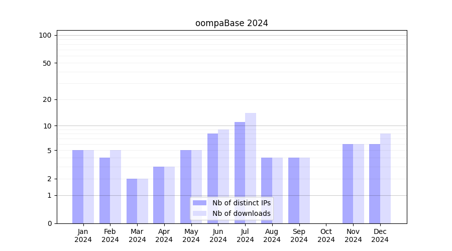 Number of downloads for software package oompaBase, year by year, from 2025 back to 2014 (years with no downloads are omitted):