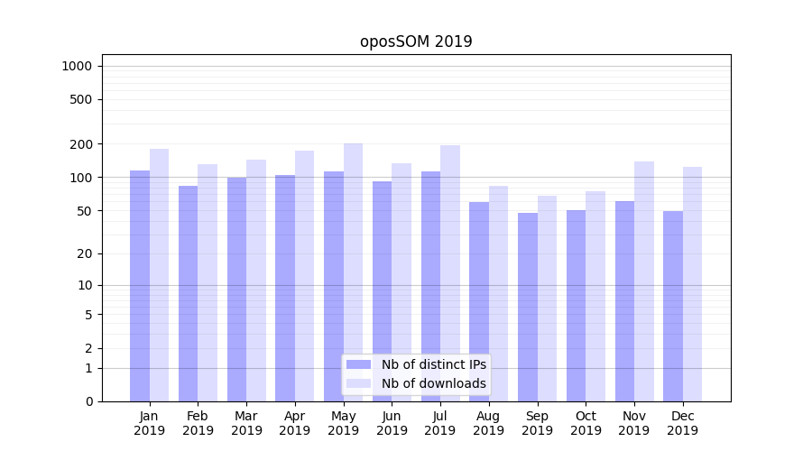 Number of downloads for software package oposSOM, year by year, from 2025 back to 2014 (years with no downloads are omitted):