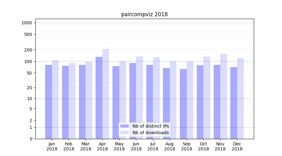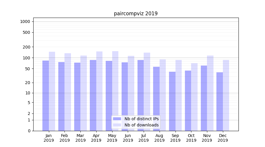 Number of downloads for software package paircompviz, year by year, from 2025 back to 2014 (years with no downloads are omitted):