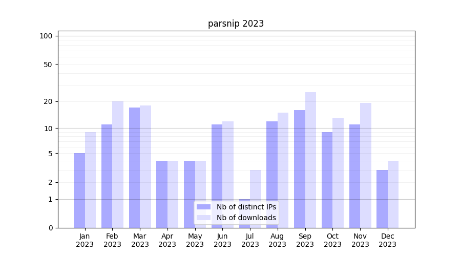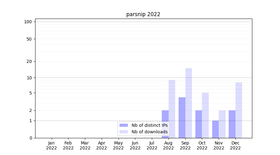 Number of downloads for software package parsnip, year by year, from 2025 back to 2014 (years with no downloads are omitted):