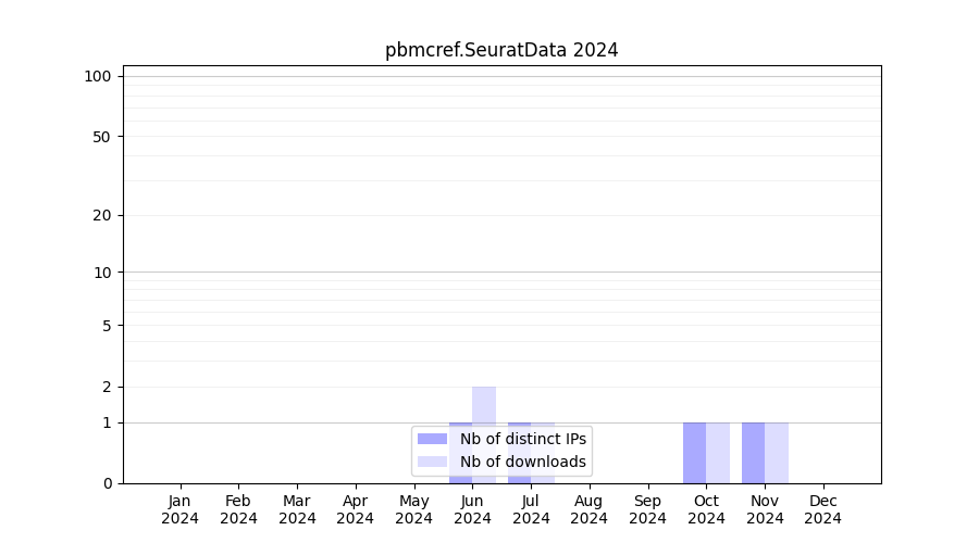 Number of downloads for software package pbmcref.SeuratData, year by year, from 2025 back to 2014 (years with no downloads are omitted):