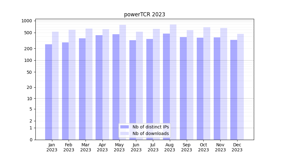 Number of downloads for software package powerTCR, year by year, from 2025 back to 2014 (years with no downloads are omitted):