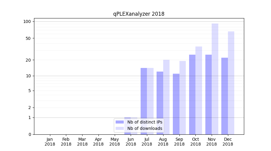 Number of downloads for software package qPLEXanalyzer, year by year, from 2025 back to 2014 (years with no downloads are omitted):