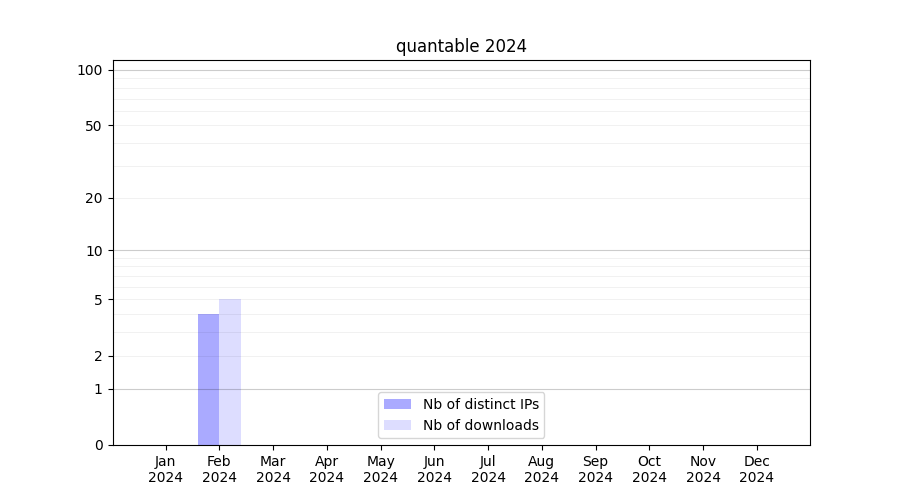 Number of downloads for software package quantable, year by year, from 2025 back to 2014 (years with no downloads are omitted):