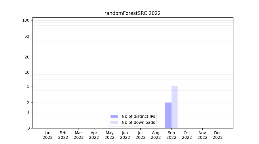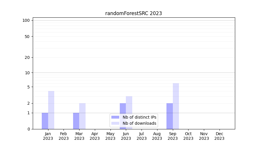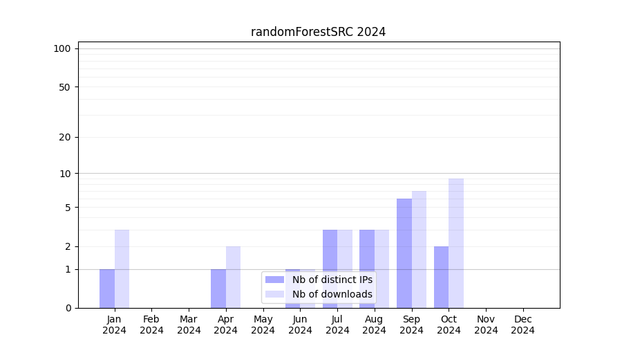 Number of downloads for software package randomForestSRC, year by year, from 2025 back to 2014 (years with no downloads are omitted):