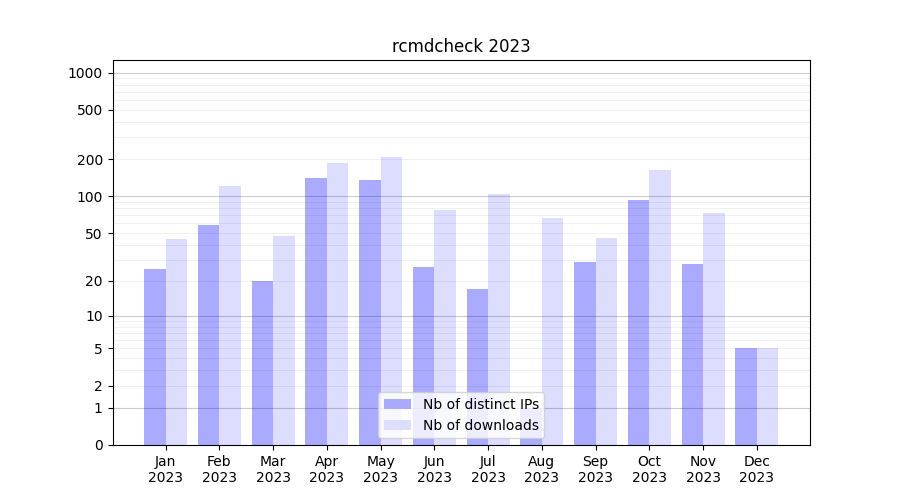 Number of downloads for software package rcmdcheck, year by year, from 2025 back to 2014 (years with no downloads are omitted):