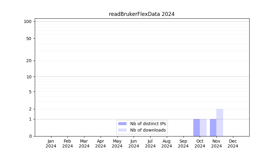 Number of downloads for software package readBrukerFlexData, year by year, from 2025 back to 2014 (years with no downloads are omitted):