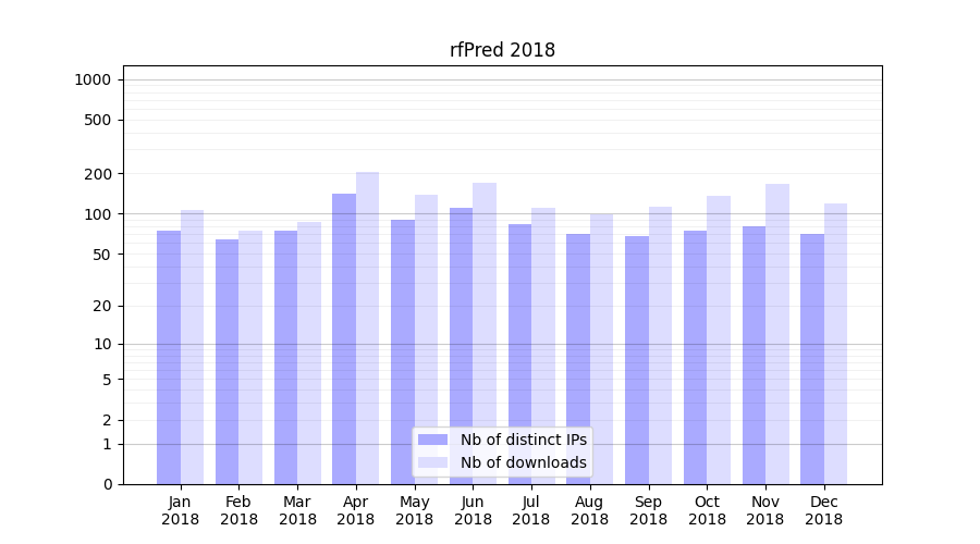 Number of downloads for software package rfPred, year by year, from 2025 back to 2014 (years with no downloads are omitted):