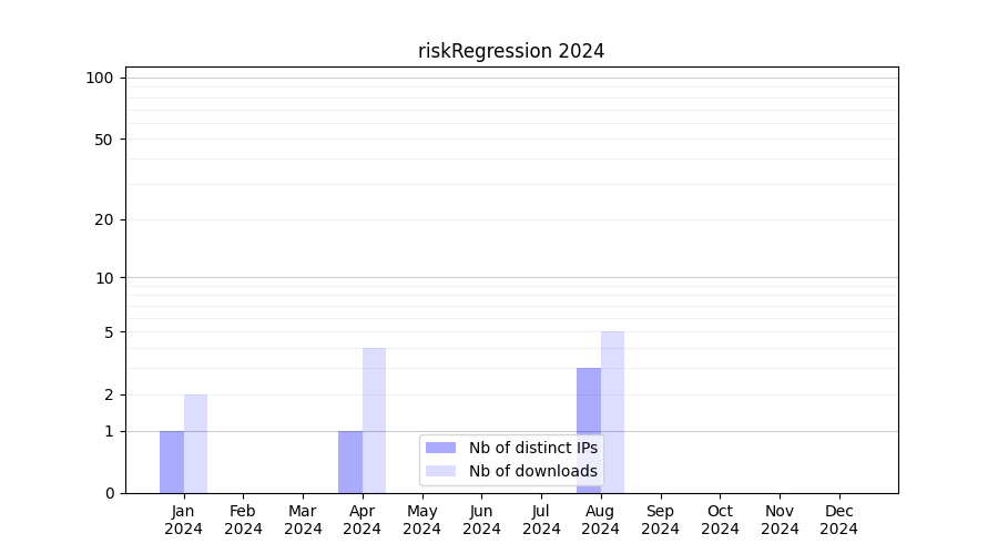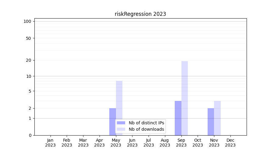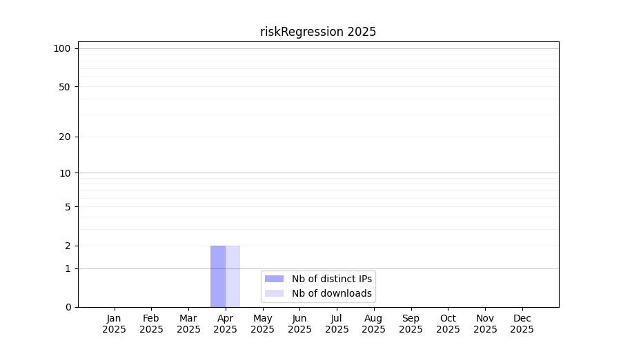 Number of downloads for software package riskRegression, year by year, from 2025 back to 2014 (years with no downloads are omitted):