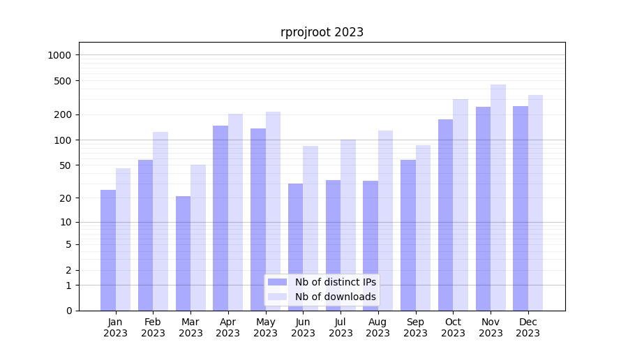Number of downloads for software package rprojroot, year by year, from 2025 back to 2014 (years with no downloads are omitted):