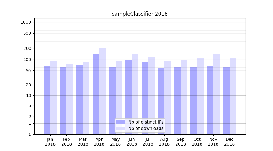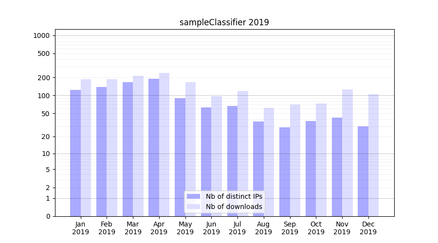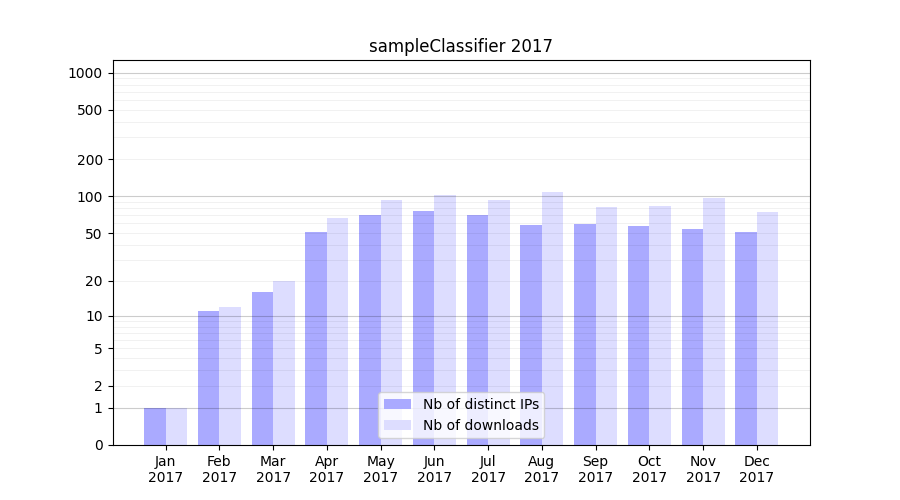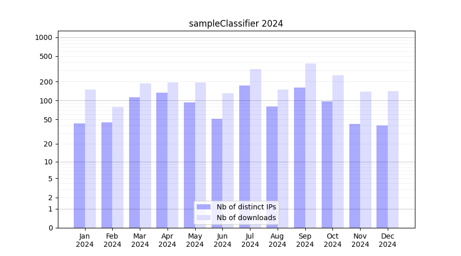 Number of downloads for software package sampleClassifier, year by year, from 2025 back to 2014 (years with no downloads are omitted):