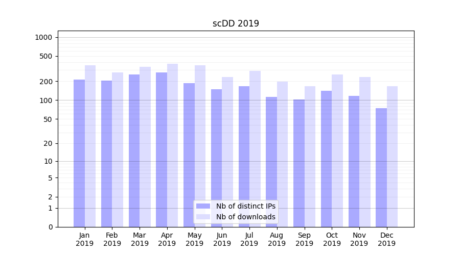 Number of downloads for software package scDD, year by year, from 2025 back to 2014 (years with no downloads are omitted):