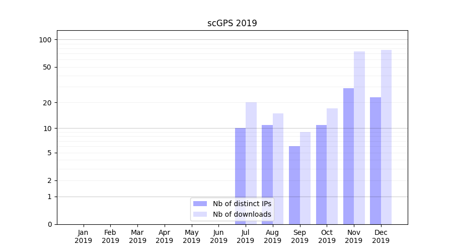 Number of downloads for software package scGPS, year by year, from 2025 back to 2014 (years with no downloads are omitted):