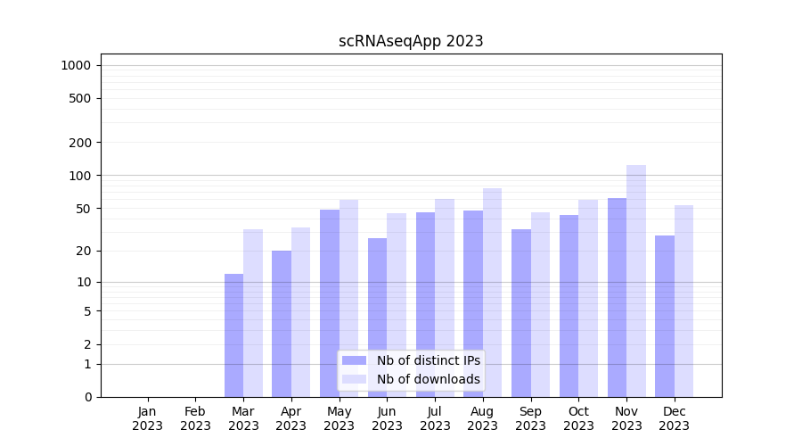Number of downloads for software package scRNAseqApp, year by year, from 2025 back to 2014 (years with no downloads are omitted):