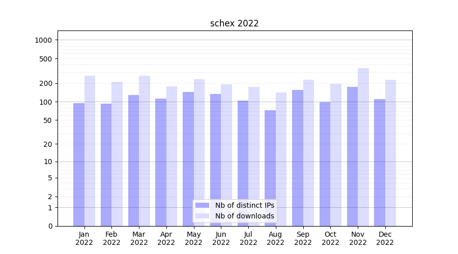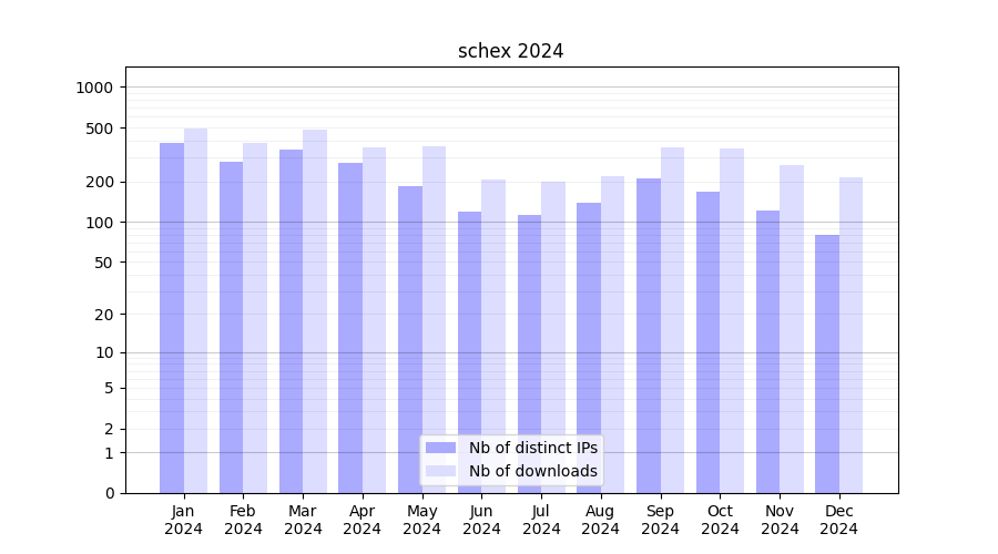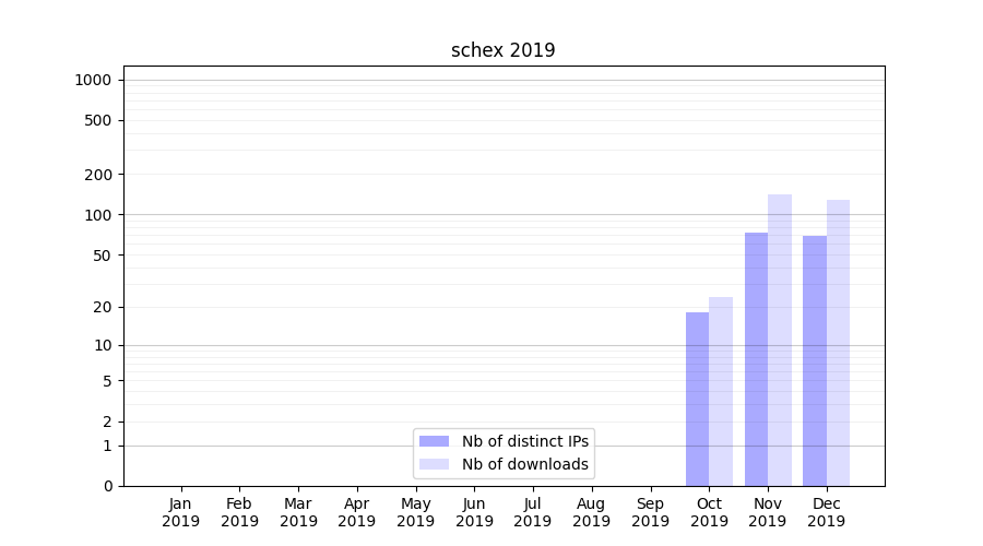 Number of downloads for software package schex, year by year, from 2025 back to 2014 (years with no downloads are omitted):