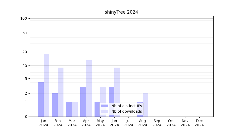 Number of downloads for software package shinyTree, year by year, from 2025 back to 2014 (years with no downloads are omitted):